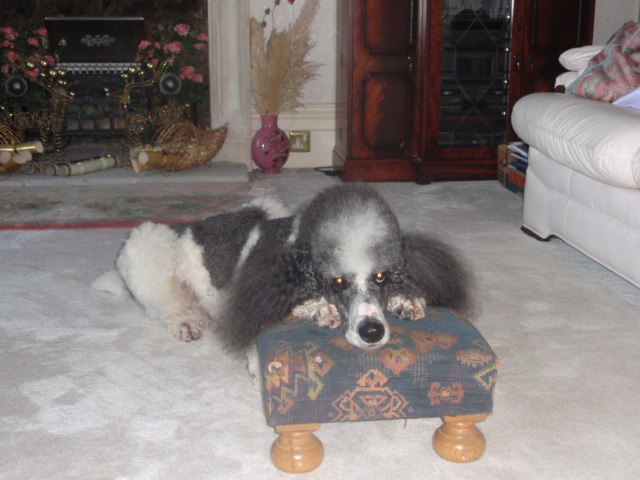 When I spoke with Sara by phone, I realized that her dog Blaze is quite an amazing ambassador for partis in the U.K. This color is still quite rare in her country. In fact, to the best of her knowledge, Blaze was the first male parti-colored Standard Poodle in England since the 1970’s (Sara states that by then they had been culled out of the British lines.) A great deal of thought was put into his selection, since Sara has a passion for the breed and wanted to import something very special to re-introduce the parti-color in her country (note: the British spelling is actually parti-coloured).