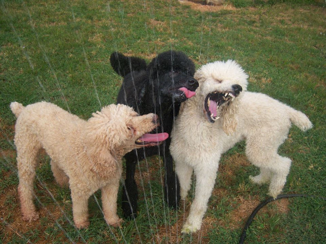When my friend Becky Godbey posted this photo of some of her Poodles having such a wonderful time playing in the sprinkler, I couldn't resist asking if I could share it with you. After all, it was sixty degrees here in the southern Virginia mountains today so Spring is definitely on its way! I feel almost guilty talking about it when some of my friends in New England are buried under 20 inches of snow. Prayers that soon warm weather will be headed your way as well.